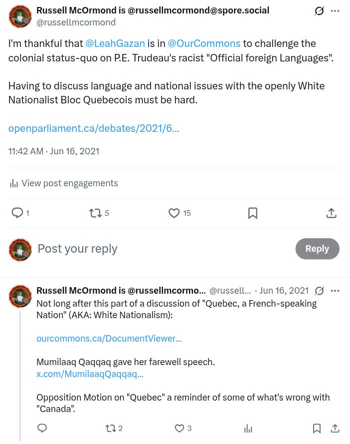 I'm thankful that Leah Gazan in in the Canadian House of Commons to challenge the colonial status-quo on P.E. Trudeau's racist "Official foreign Languages". Having to discuss language and national issues with the openly White Nationalist Bloc Quebecois must be hard. https://openparliament.ca/debates/2021/6/15/leah-gazan-1/