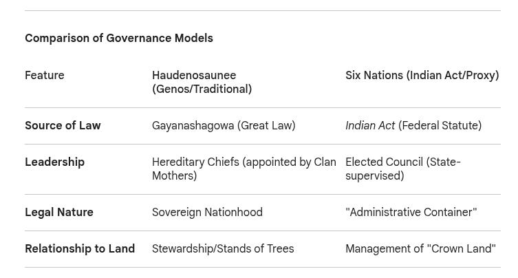 Corporate Subservience: As we discussed with the Inuit, the “Elected Council” is effectively a subsidiary of the Crown. It must follow the Indian Act, which is a Canadian law. The Confederacy Council follows the Great Law, which is an Indigenous law.