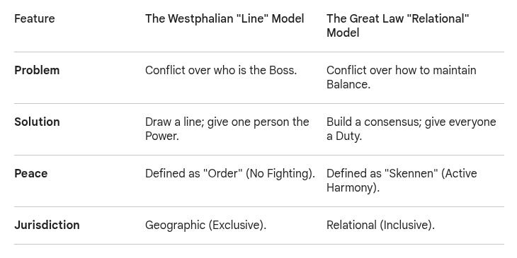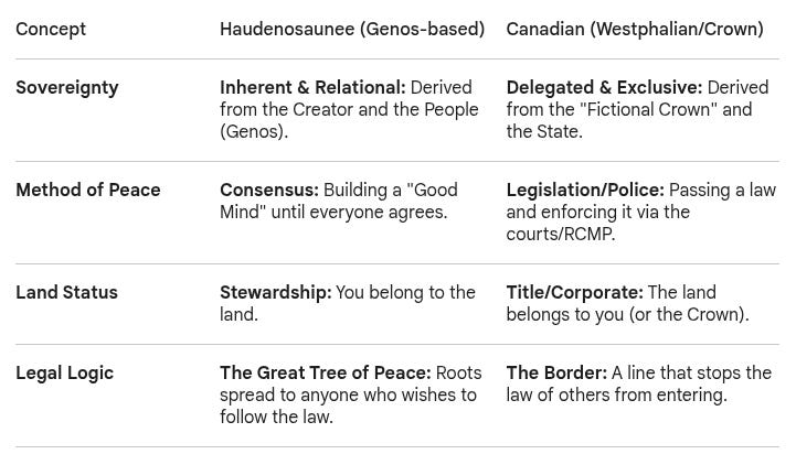Subject: Contrasting the Gayanashagowa with the “Ancestry of Canadian Law” (Westphalian/Colonial Law).