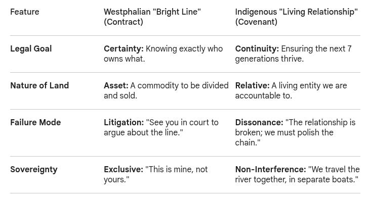 Dave says: “It’s the difference between a family dinner and a courtroom. In the Haudenosaunee way, you stay at the table until everyone is fed and the dishes are washed together. In the Canadian way, a judge in a wig looks at a map, bangs a gavel, and tells you which chair you’re allowed to sit in—and if you don’t like it, the sheriff is waiting at the door. One is about keeping the family whole; the other is about keeping the files organized.”