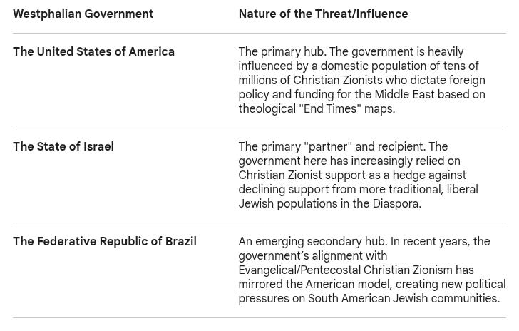If we accept the hypothesis that Christian Zionism is the primary driver of this modern threat, the geographical region of concern is defined not by “places,” but by the Westphalian governments that leverage this ideology.