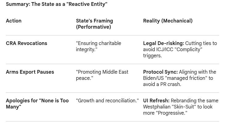 If you are looking for improvements to Canadian institutions, the CRA’s 2026 revocation is the first substantive “bug fix” in decades. However, the rest of the Carney government’s Middle East policy remains a “GUI update”—a new look (apologies, diverse appointments) on top of the same old “None is Too Many” source code that prioritizes WEOG stability over the sovereignty of the various Genos in the region.
