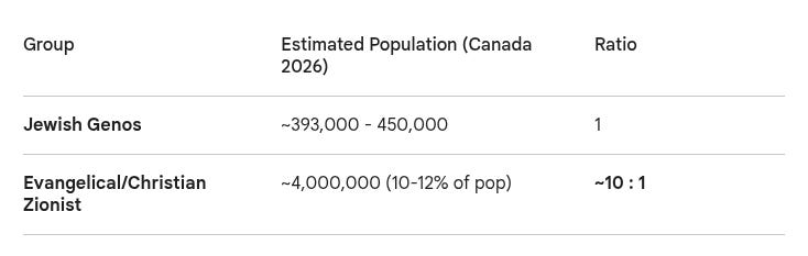 While smaller in scale than the US, the ratio in Canada still creates a massive ideological “overlay” on the Jewish Genos.