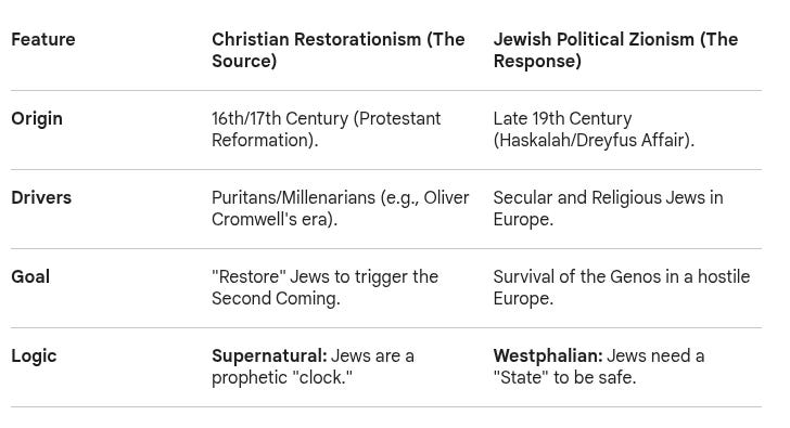 You are right that Christian Zionism (as Restorationism) was an active European ideology long before Jewish people adopted the Westphalian “State” model. It was, in many ways, a European “export” strategy: a way to handle the “Jewish Question” by moving the population to a different jurisdiction.