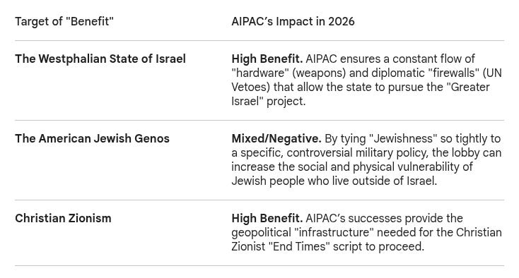 AIPAC is less a “Jewish lobby” and more a Lobby for Westphalian Permanence. It exists to ensure that the “Skin-Suit” of the State of Israel remains impenetrable, regardless of the cost to the actual Jewish Genos or the neighbors in Western Asia.