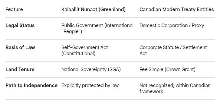 Self-Determination (Articles 3 & 4): UNDRIP Article 3 states Indigenous peoples have the right to freely determine their political status. Critics argue that requiring a nation to incorporate as a Canadian company forces them into a neoliberal framework. This makes their “autonomy” contingent on provincial or federal corporate law, which is inherently subservient to the Crown, unlike the “Public Law” status of Greenland.