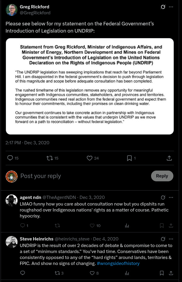 While it is disgusting enough to see these obviously conflicting mandates within a single minister, what he said about UNDRIP would be comical if it were not likely what the provincial government will try to use to further delay UNDRIP.